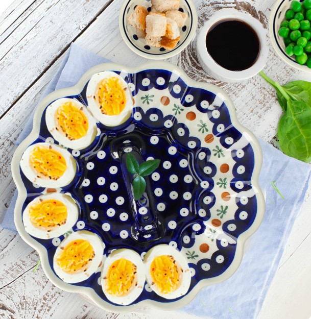 👉 Servește-le pe un platou oval din ceramică poloneză cu motive florale – contrastul dintre galbenul ouălor și albastrul decorului este superb.