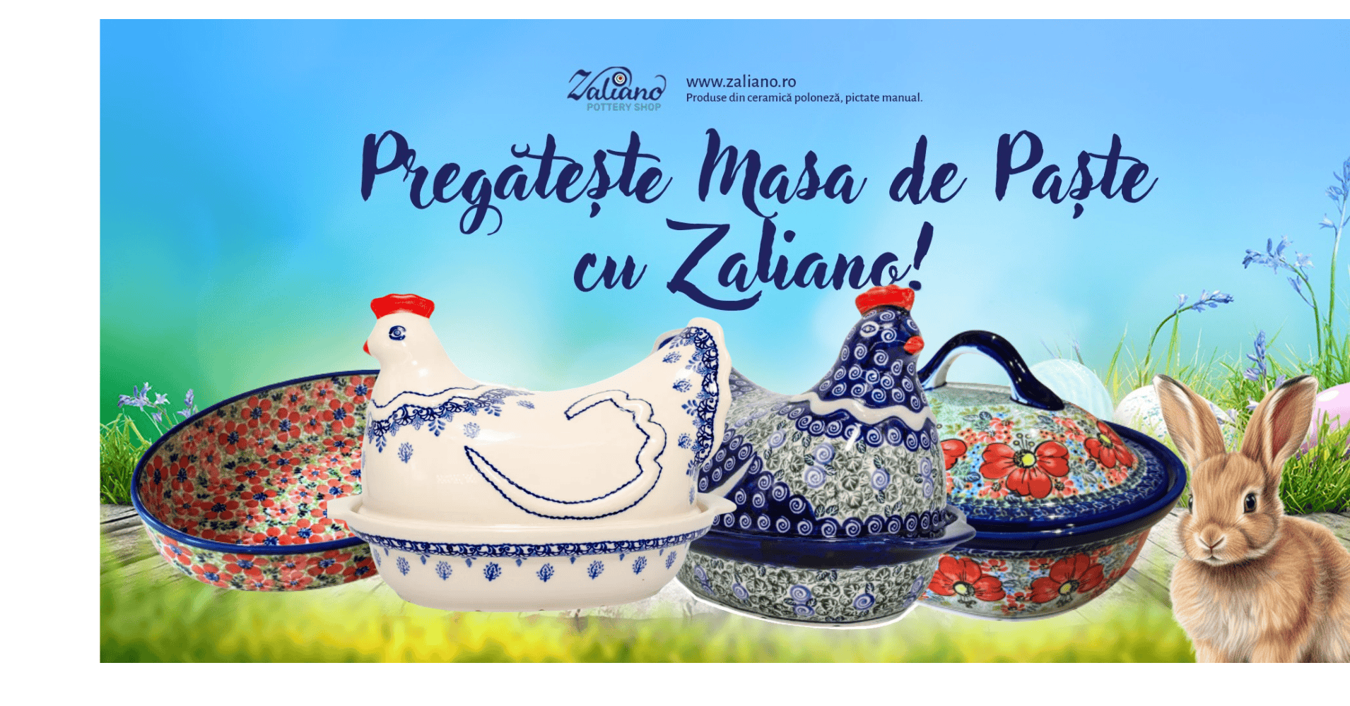 Personalizeaza-ti masa de Paste cu vesela ceramica si decoratiuni de sezon, utile si functionle, pictate manual in culori vesele. Descopera o gama variata de modele si forme in culori variate. Am pregatit special pentru Paste, vase pentru gatit si de servit: platouri pentru oua, tavi pentru cozonac si vase pentru cuptor in forma de gaina. O multitudine de decoratiuni florale in culori vibrante cu mult galben, albastru cobalt si verde.